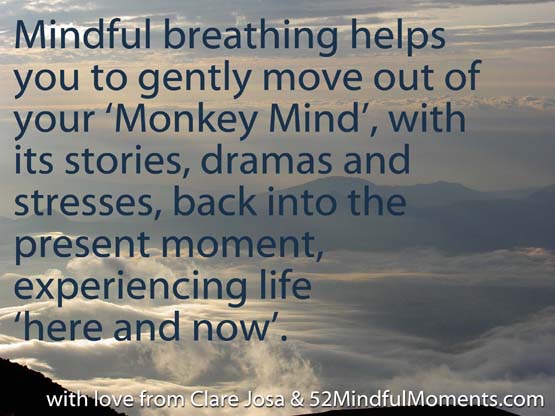 Mindful breathing helps you to gently move out of your ‘Monkey Mind’, with its stories, dramas and stresses, back into the present moment, experiencing life ‘here and now’.