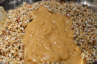 - Mix all the dry ingredients together. Mix the apple / date / fig puree with the dried ingredients (see picture).