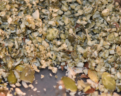 - In a food processor, blitz the pumpkin seeds to chop them quite finely – see picture.