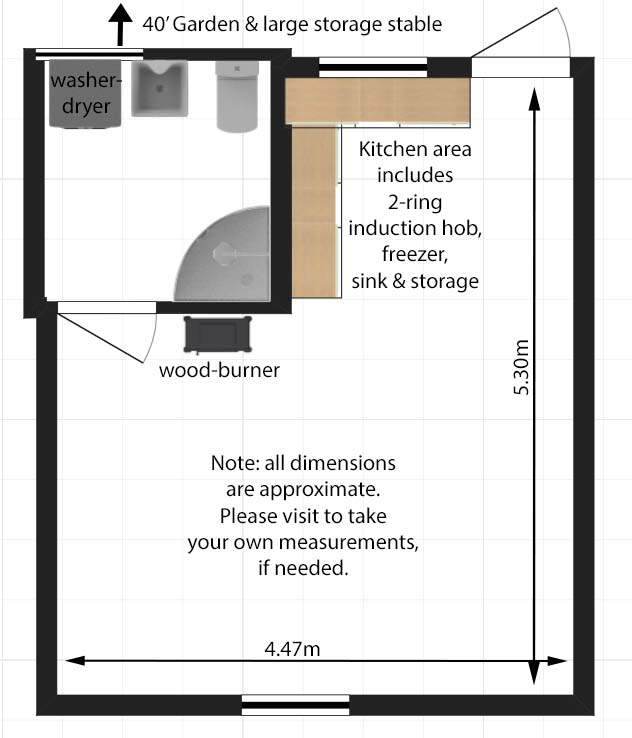 Here's the approximate floor plan, so you can get a feel for how you and your belongings will fit. You have the storage stable at the bottom of your garden for all of your extras.